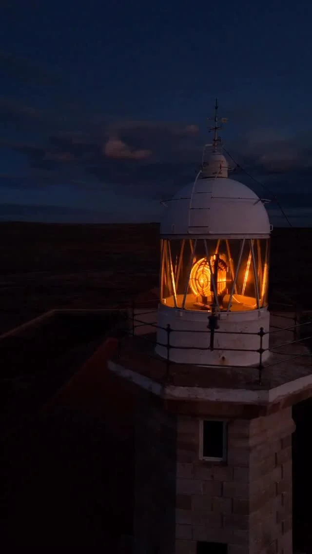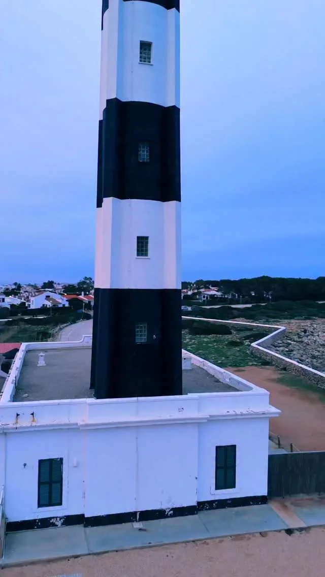 A lighthouse stands on the edge of the ocean during sunset, with a colorful sky of pink, purple, and orange hues. Aerial view shot by drone. Cap d'Artrutx en Menorca.