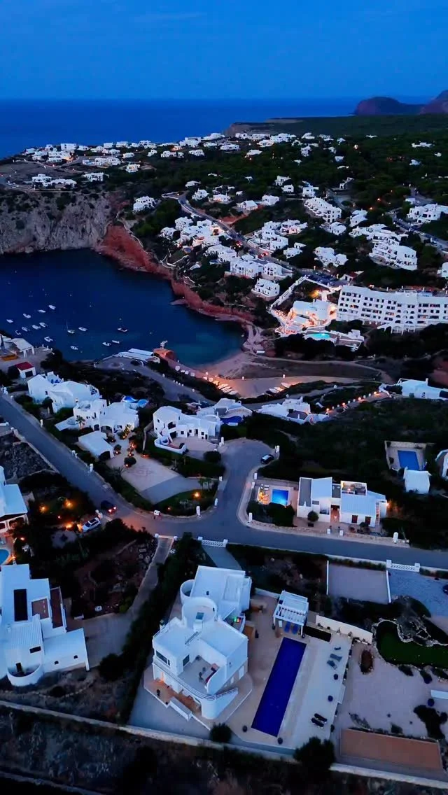 Aerial view shot by drone of a coastal residential area in Menorca with white buildings and red rooftops along rocky shores, surrounded by green hills and deep blue ocean waters.