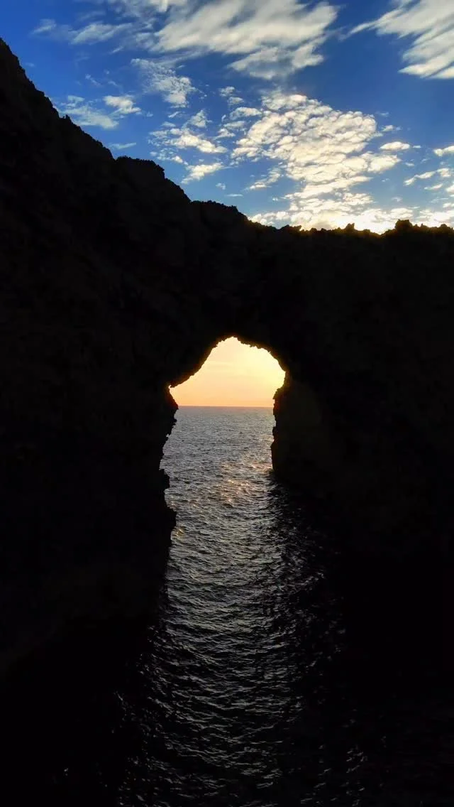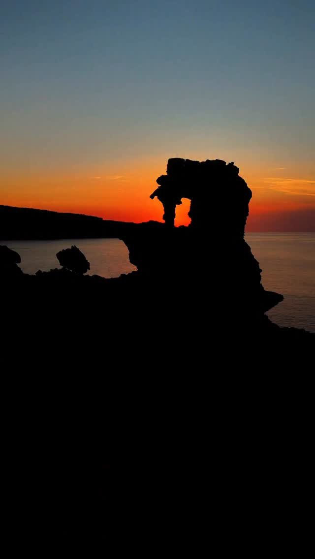 Sunset over a rocky coastal archway in Menorca with a silhouette of a person standing on the cliff above, with calm water reflecting the arch and sky with scattered clouds. Aerial view shot by drone.