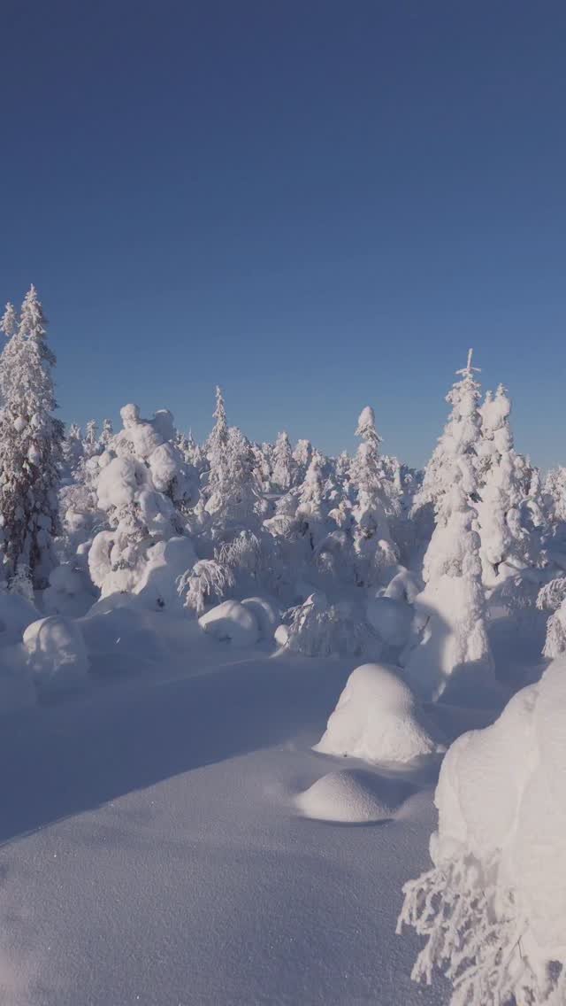 Snow-covered landscape in Lapland with trees and a setting or rising sun near the horizon. Aerial view shot by drone.